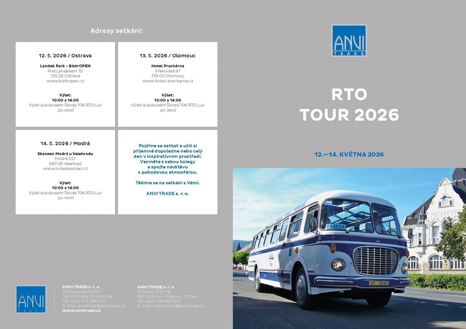 Vydejte se s námi na RTO TOUR 2026 a zastavte se na některé z našich zastávek napříč Českou republikou. Čeká Vás příjemné setkání v inspirativním prostředí, kde můžete načerpat nové informace, prohlédnout si produkty a strávit pohodový den s kolegy z oboru.