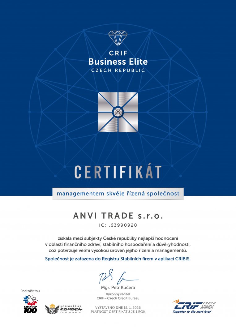 Prestižní ocenění CRIF Business Elite a CRIF TOP Business Elite uděluje společnost CRIF – Czech Credit Bureau, a.s. ve spolupráci s organizací CZECH TOP 100. Je určeno pouze firmám, které dlouhodobě vykazují vysokou úroveň ekonomické výkonnosti, odpovědného hospodaření a strategického řízení.