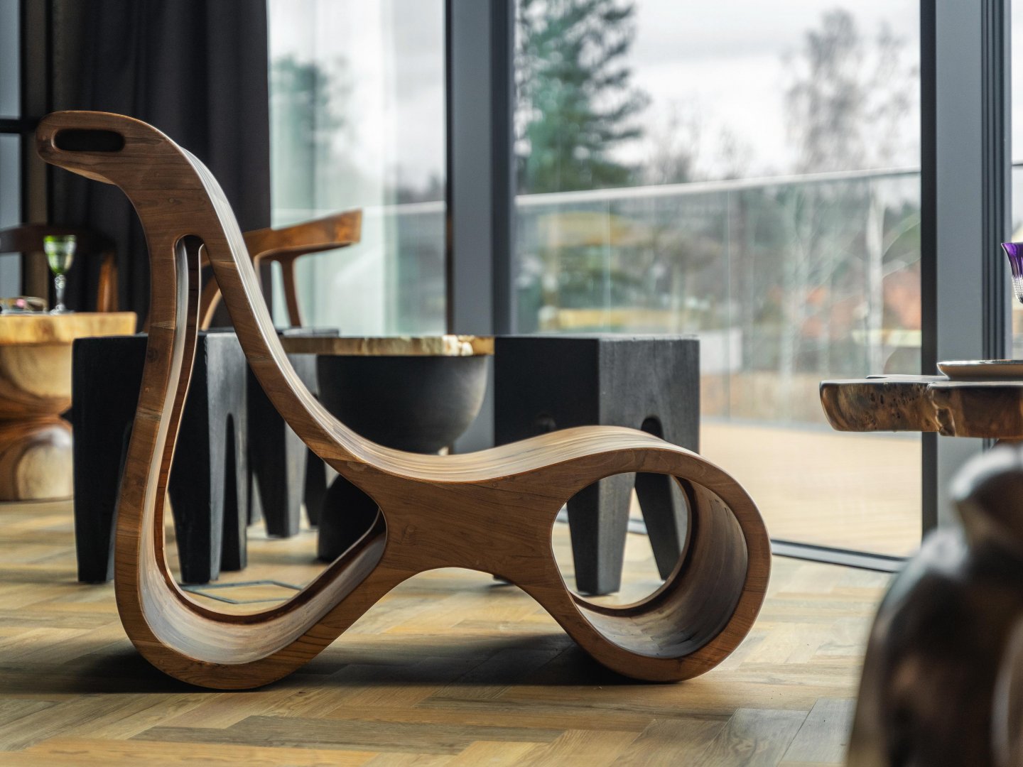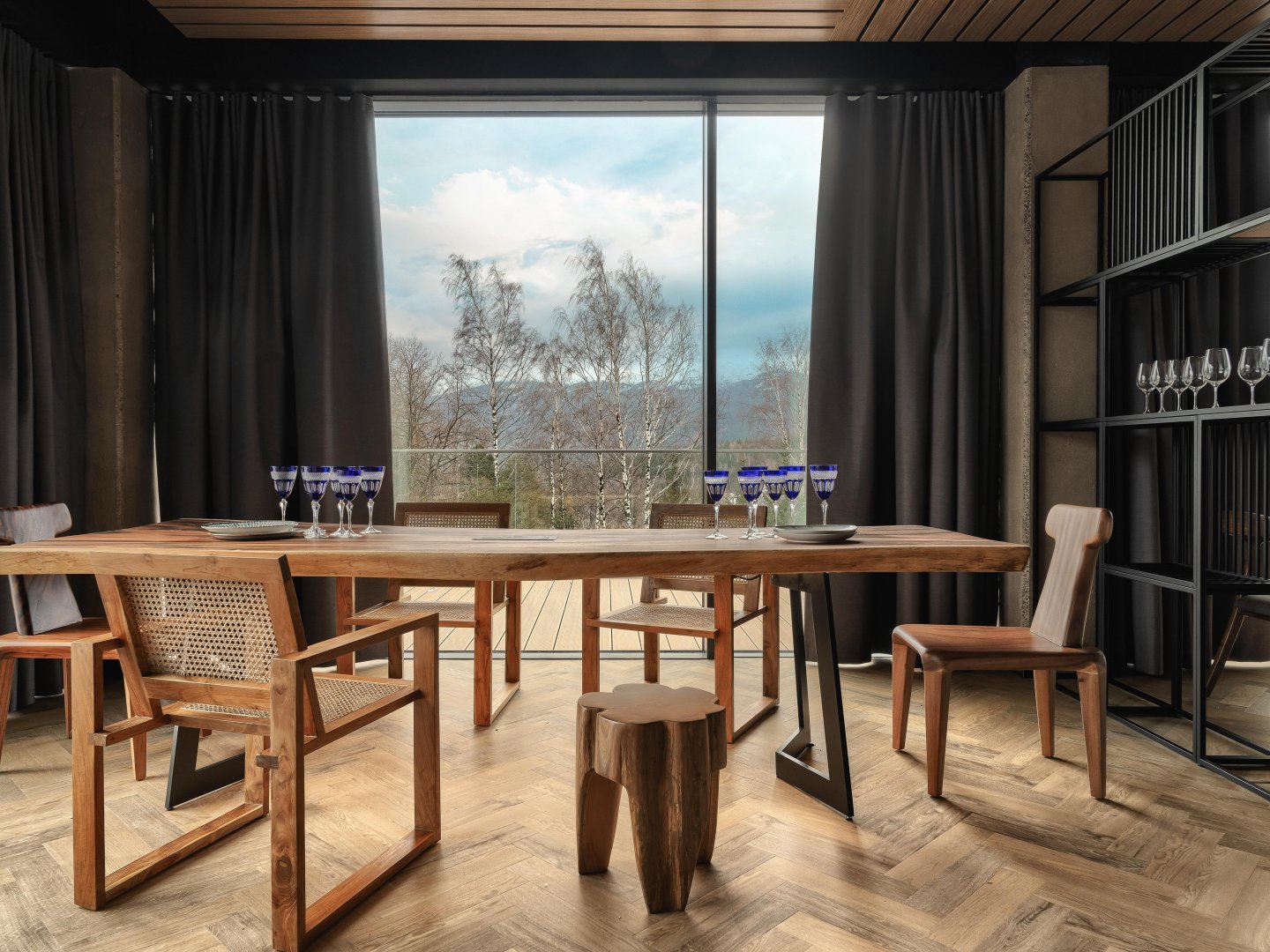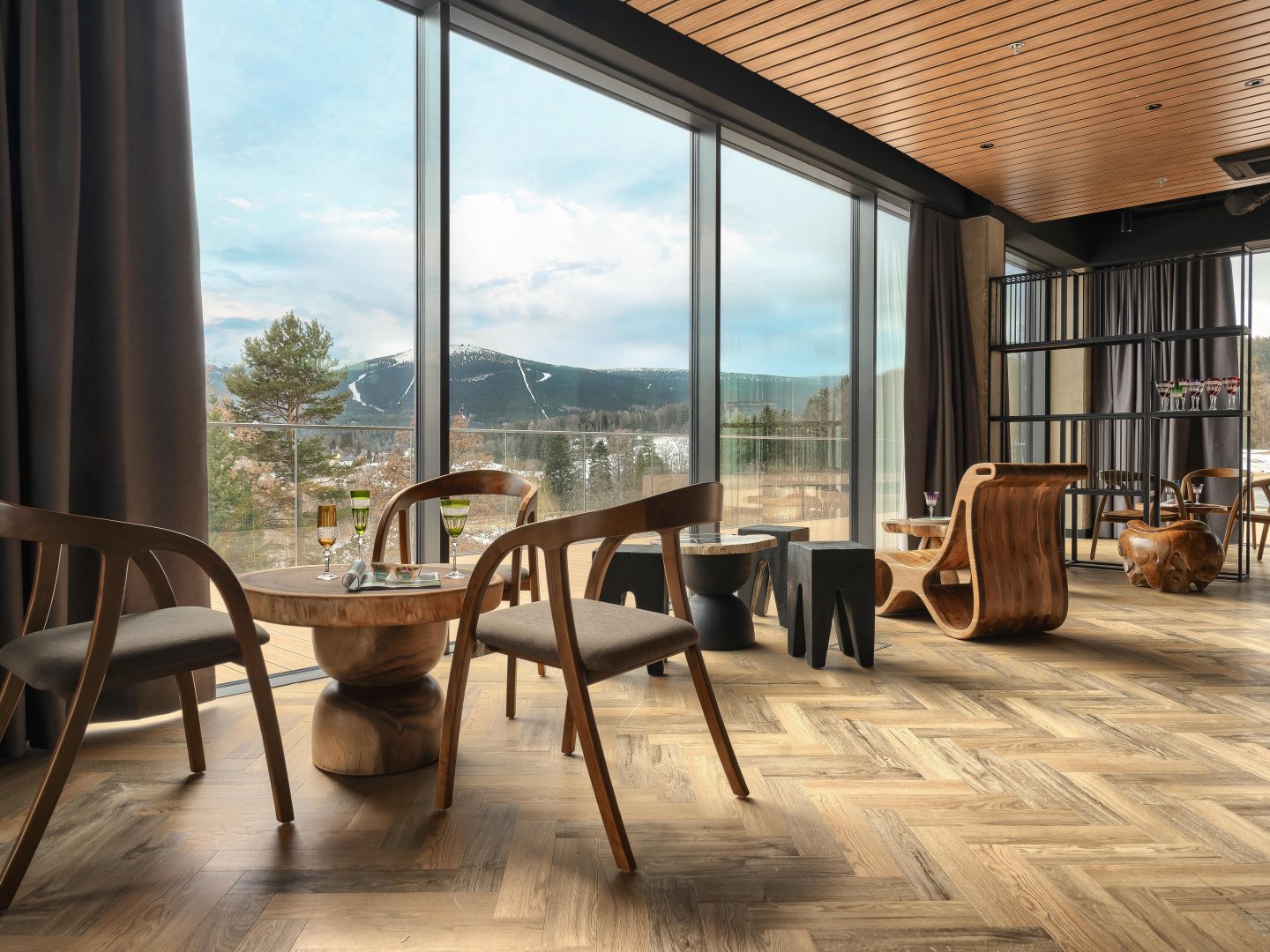 Kombinace různých dřevodekorů posiluje propojení s přírodou – interiér tak plynule navazuje na okolní krajinu a nabízí útulné prostředí pro nerušený pobyt plný komfortu.