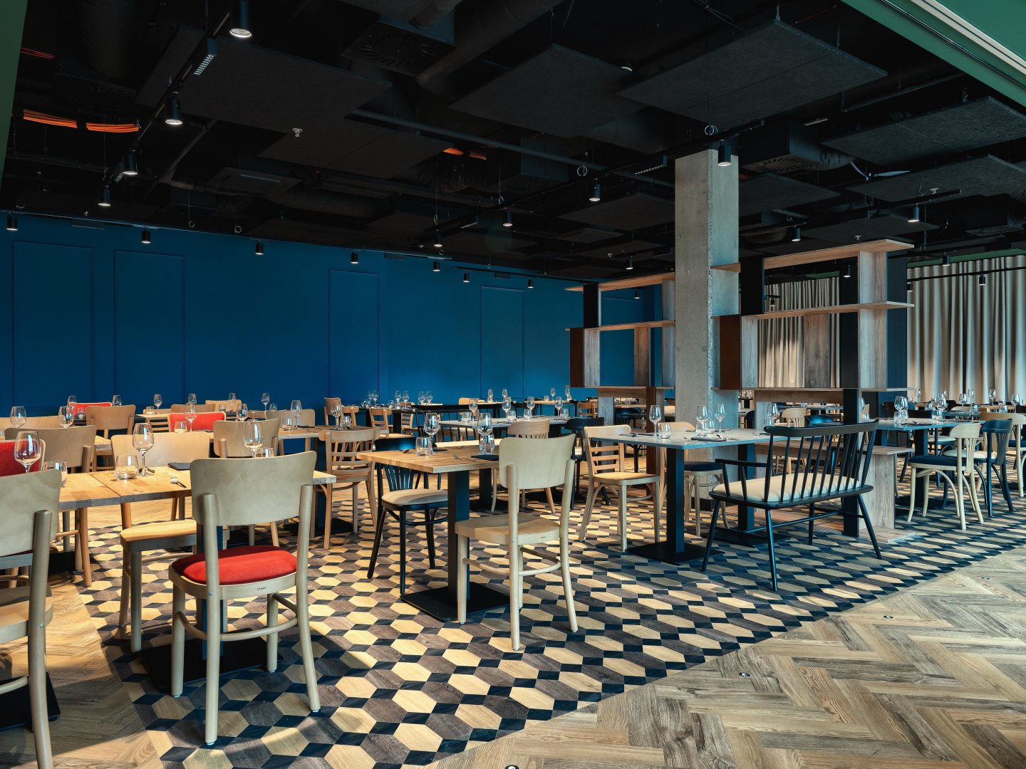Odvážný geometrický motiv s výraznou estetikou. Je navržený tak, aby vytvářel poutavé ohniskové body a zvýrazněné zóny. Výborně spolupracuje s ostatními vzory – například s parketou v tomto projektu – a lze jej využít ke zřetelnému vizuálnímu rozdělení prostoru.